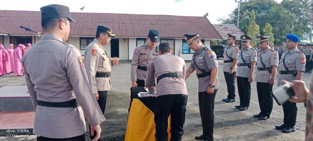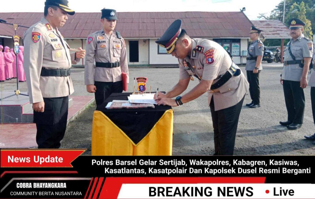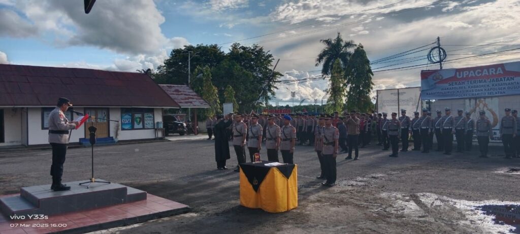 Polres Barsel – Polres Barito Selatan (Barsel), menggelar Upacara Serah Terima Jabatan (Sertijab) Wakapolres, Kabag Perencanaan (Kabagren), Kepala Seksi Pengawasan (Kasiwas), Kasatlantas, Kasatpolair dan Kapolsek Dusun Selatan pada Jumat (7/4/2025) sore.