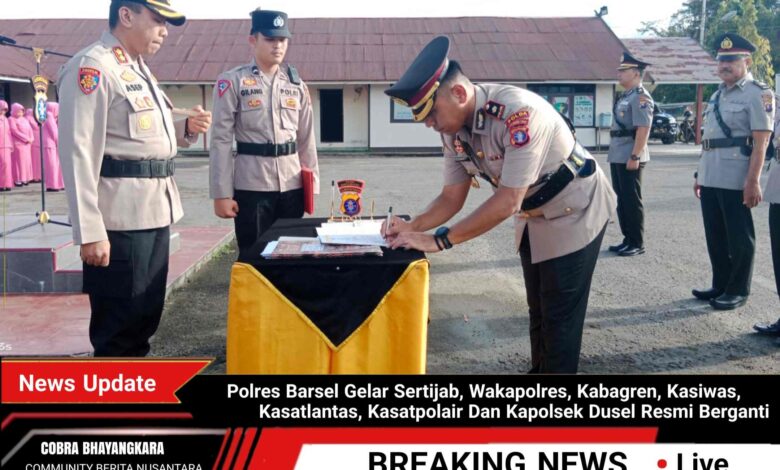 Polres Barsel – Polres Barito Selatan (Barsel), menggelar Upacara Serah Terima Jabatan (Sertijab) Wakapolres, Kabag Perencanaan (Kabagren), Kepala Seksi Pengawasan (Kasiwas), Kasatlantas, Kasatpolair dan Kapolsek Dusun Selatan pada Jumat (7/4/2025) sore.
