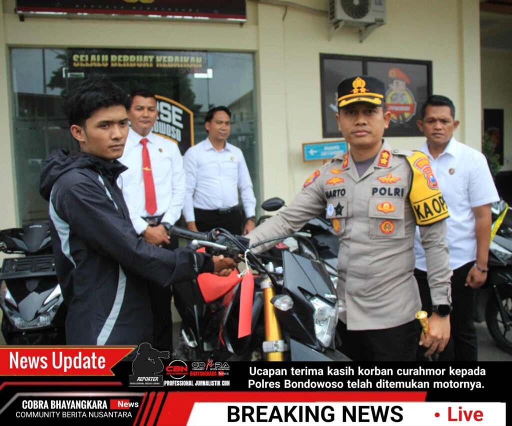 Penyerahan motor pada korban secara gratis ini, diserahkan langsung oleh Kapolres Bondowoso, AKBP Harto Agung Cahyono, pada Senin (24/3/2025).