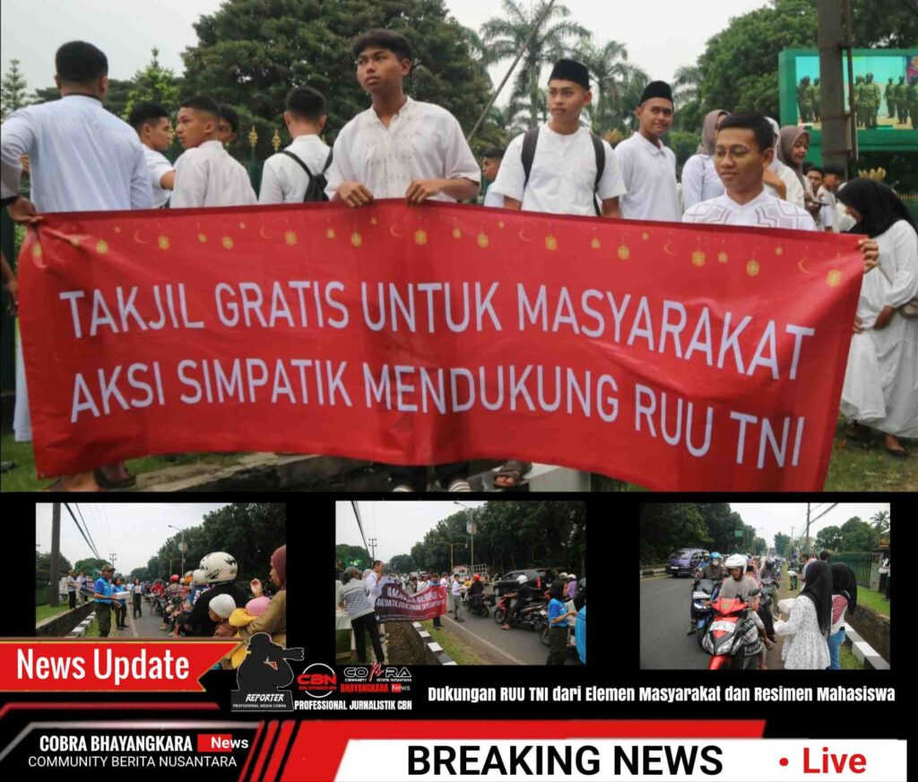 Dalam semangat kebersamaan dan kepedulian terhadap masa depan bangsa, berbagai elemen masyarakat bersama Resimen Mahasiswa dari beberapa universitas di Malang menggelar aksi berbagi takjil gratis. Kegiatan ini bertujuan untuk menunjukkan dukungan terhadap Rancangan Undang-Undang (RUU) Tentara Nasional Indonesia (TNI) yang tengah menjadi perhatian publik. Malang (26/3/2025)