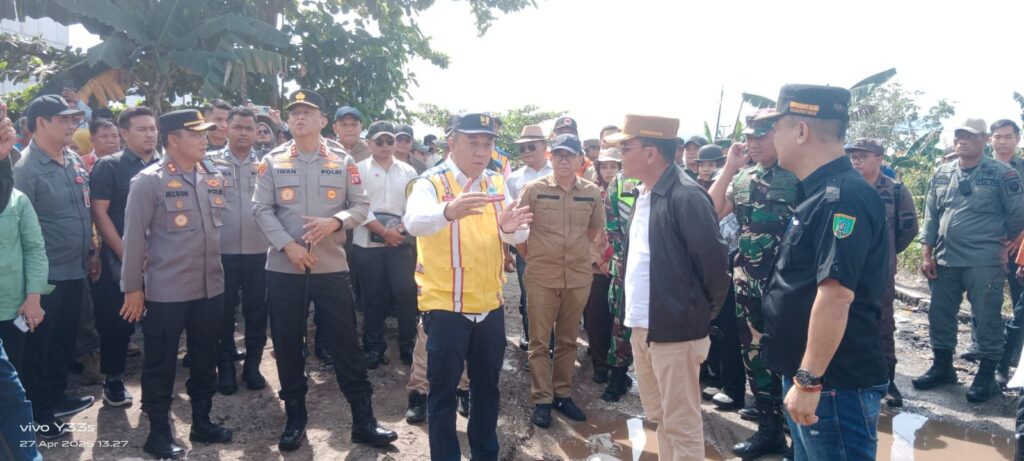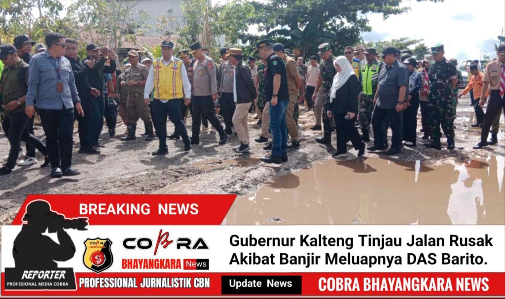 Gubernur Kalimantan Tengah (Kalteng) H Agustiar Sabran bersama rombongan meninjau ruas jalan nasional Buntok – Palangka Raya yang ambruk akibat banjir di Desa Pararapak Kecamata Dusun Selatan (Dusel) Kabupaten Barito Selatan (Barsel) Minggu ( 27/4/2025).