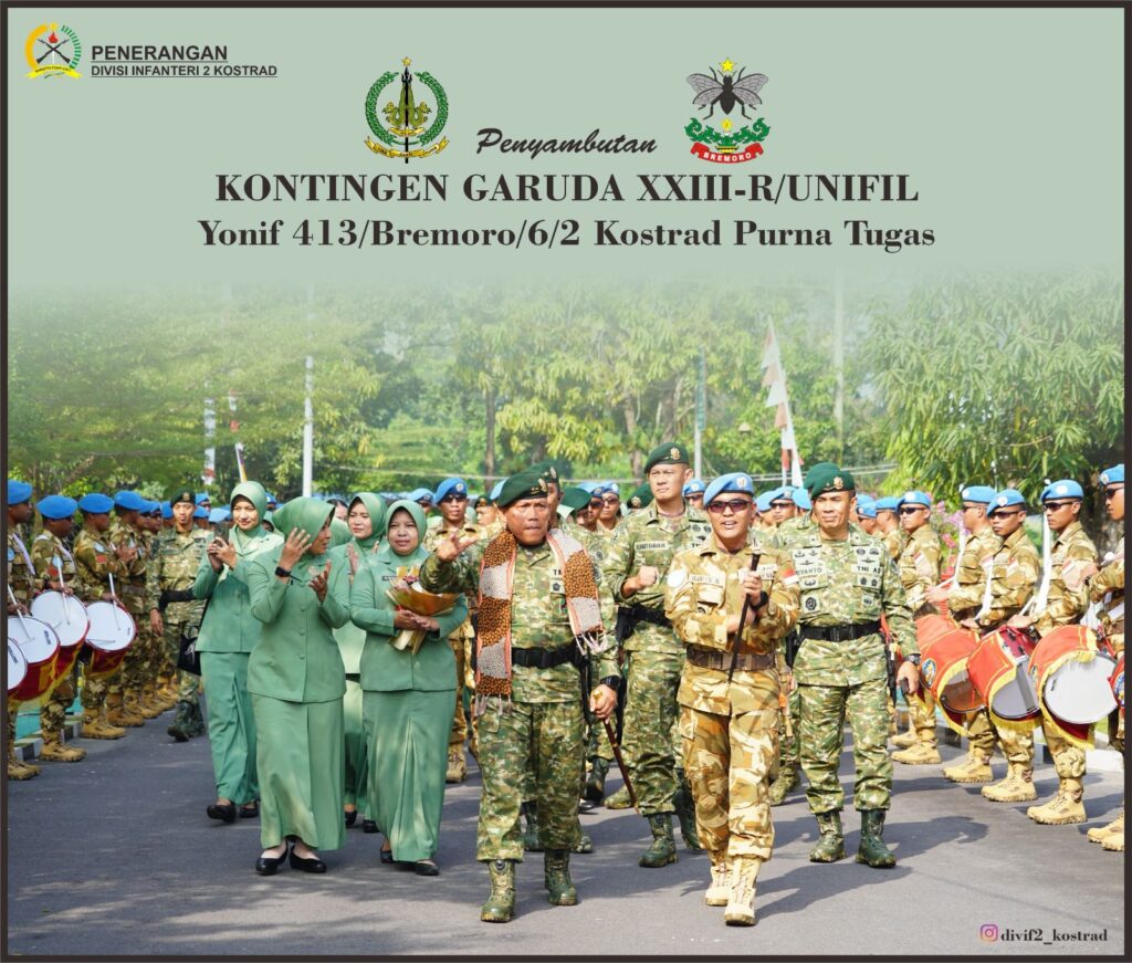 Seluruh prajurit Divif 2 Kostrad yang tergabung dalam Satgas Yonmek TNI Konga XXIII-R/Unifil Yonif 413/Bremoro/6/2 Kostrad dengan bangga telah menyelesaikan tugas mereka sebagai Pasukan Perdamaian Perserikatan Bangsa-Bangsa (PBB) di Lebanon. Tugas mulia yang mereka emban selama satu tahun ini menjadi salah satu kontribusi nyata Indonesia dalam menjaga perdamaian dunia.