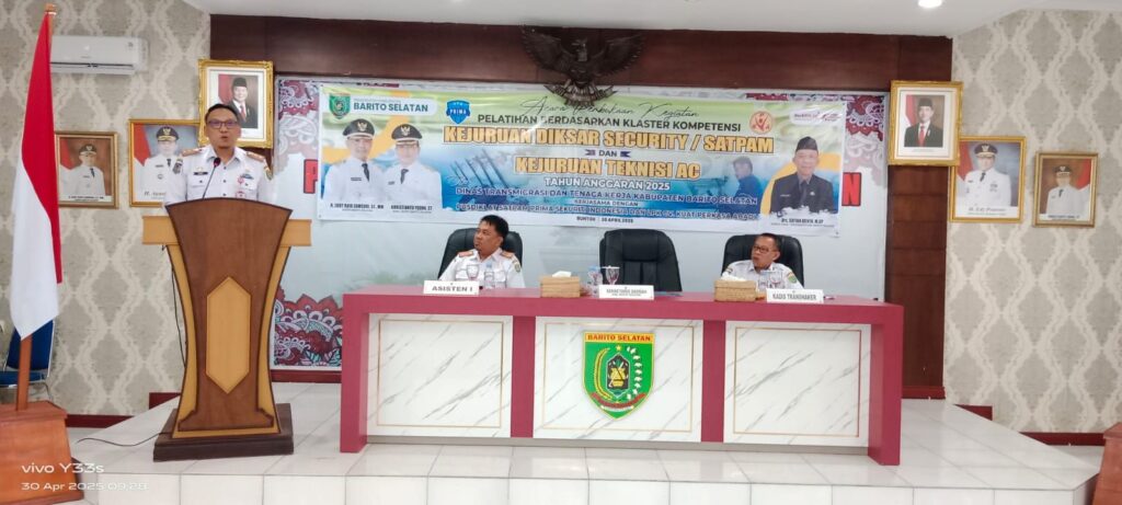 Pemerintah Kabupaten (Pemkab) Barito Selatan (Barsel) melalui Dinas Transmigrasi dan Tenaga Kerja bekerjasama dengan Pusdiklat Satpam Prima Sekuriti Indonesia dan LPK CV Kuat Perkasa Abadi. Kegiatan kursus ini gratis bagi masyarakat pencari kerja di Barito Selatan.Bertempat Aula Setda, Rabu, (30/04/2025).