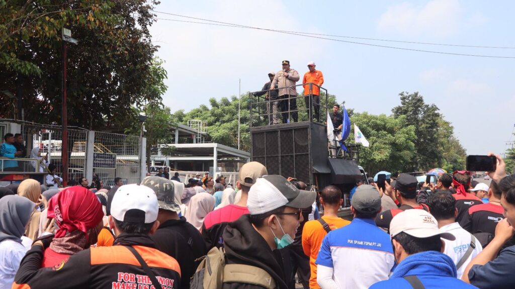 Kegiatan kedua adalah keberangkatan ±650 buruh dari serikat FSPMI, KSPSI, dan KSBSI menuju Gedung Grahadi Surabaya, dengan titik kumpul di PT JA’I. Kedua agenda berlangsung aman, tertib, dan lancar dengan pengawalan ketat dari pihak kepolisian bersama unsur terkait lainnya.