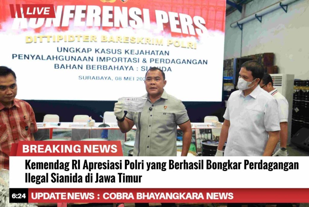 Direktur Tertib Niaga Ditjen Perlindungan Konsumen Kemendag RI, Mario Josko memberikan apresiasi kepada Kepolisian yang telah berhasil mengungkap perdagangan ilegal Sianida di Surabaya dan Pasuruan, Jawa Timur.