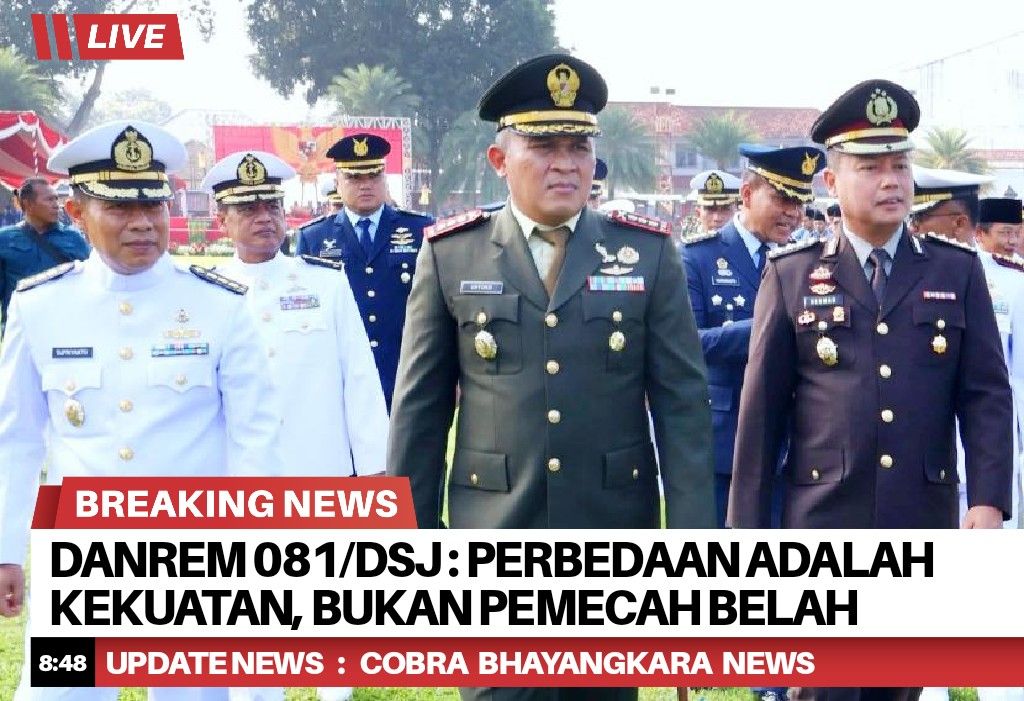“Perbedaan dan keberagaman bangsa Indonesia hendaknya dijadikan kekuatan, bukan pemecah belah. Kekuatan yang terus menyatukan dan menjadi pembeda dengan bangsa-bangsa lainnya,” kata Danrem 081/DSJ, Kolonel Arm Untoro Hariyanto usai mengikuti upacara peringatan Hari Lahir Pancasila di wilayah Jawa Timur yang dilaksanakan terpusat di Alun-Alun Kota Blitar, Senin (2/6/2025).