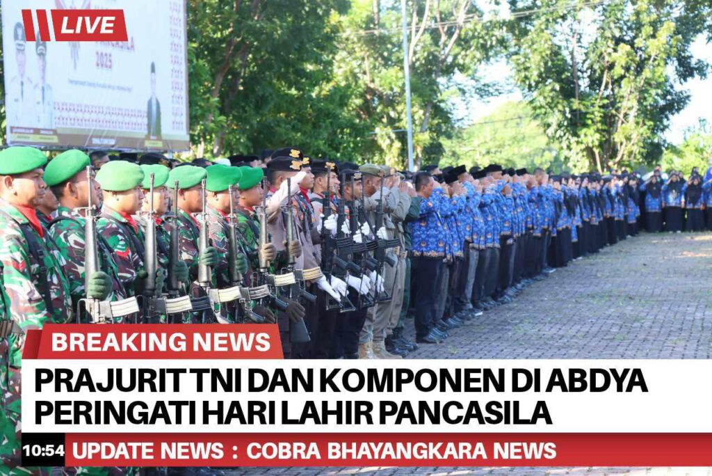 Puluhan Prajurit TNI dari Komando Distrik Militer (Kodim) 0110/Abdya beserta gabungan Kepolisian turut ambil bagian dalam upacara peringatan Hari Lahir Pancasila, berlansung di lapangan Pemerintah Kabupaten (Pemkab) Abdya, Desa Keude Paya Kecamatan Blangpidie, Senin (2/6/2025).