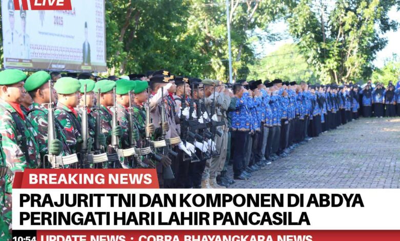 Puluhan Prajurit TNI dari Komando Distrik Militer (Kodim) 0110/Abdya beserta gabungan Kepolisian turut ambil bagian dalam upacara peringatan Hari Lahir Pancasila, berlansung di lapangan Pemerintah Kabupaten (Pemkab) Abdya, Desa Keude Paya Kecamatan Blangpidie, Senin (2/6/2025).