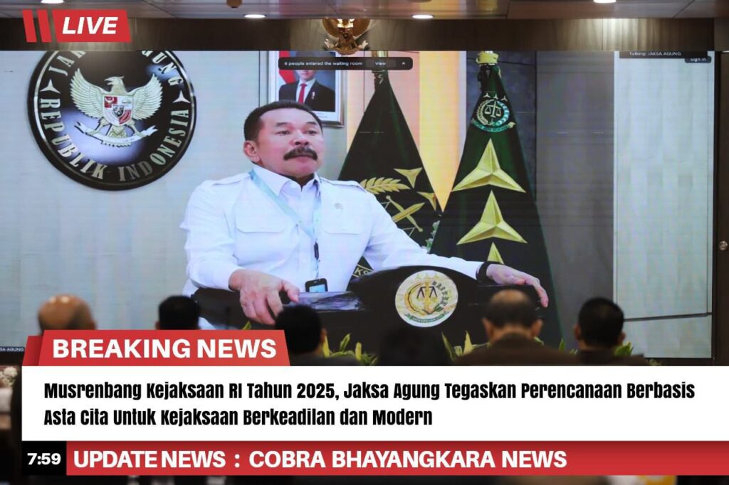 Jaksa Agung Republik Indonesia, ST Burhanuddin secara resmi membuka Musyawarah Perencanaan Pembangunan (Musrenbang) Kejaksaan RI Tahun 2025 yang mengusung tema: “Perencanaan dan Penganggaran Berbasis Asta Cita: Menuju Kejaksaan yang Berkeadilan, Humanis, Akuntabel, Transparan, dan Modern” pada Rabu 4 Juni 2025 secara virtual dari Gedung Utama Kejaksaan Agung, Jakarta.