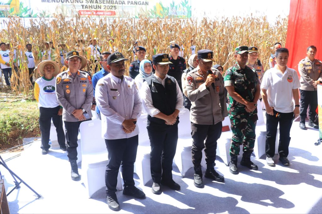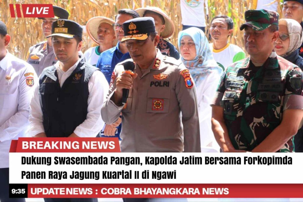 Kapolda Jatim Irjen Pol Drs Nanang Avianto, M.Si bersama Forkopimda Propinsi Jawa Timur dan Pejabat Utama Polda Jatim didampingi Kapolres Ngawi AKBP Charles Pandapotan Tampubolon, melaksanakan panen raya jagung di Desa Sumberbening Kecamatan Bringin Kabupaten Ngawi, pada Kamis (5/6/2025).