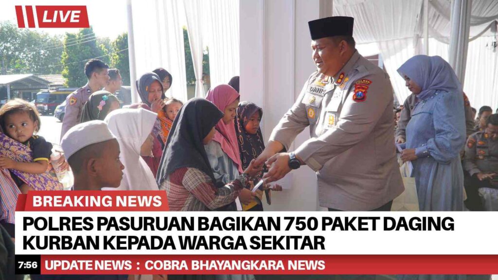 Dalam rangka Hari Raya Idul Adha 1446 H, Polres Pasuruan membagikan sebanyak 750 paket daging kurban kepada warga yang tinggal di sekitar Mapolres Pasuruan, Sabtu pagi (7/6/2025).