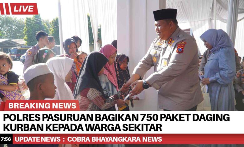 Dalam rangka Hari Raya Idul Adha 1446 H, Polres Pasuruan membagikan sebanyak 750 paket daging kurban kepada warga yang tinggal di sekitar Mapolres Pasuruan, Sabtu pagi (7/6/2025).