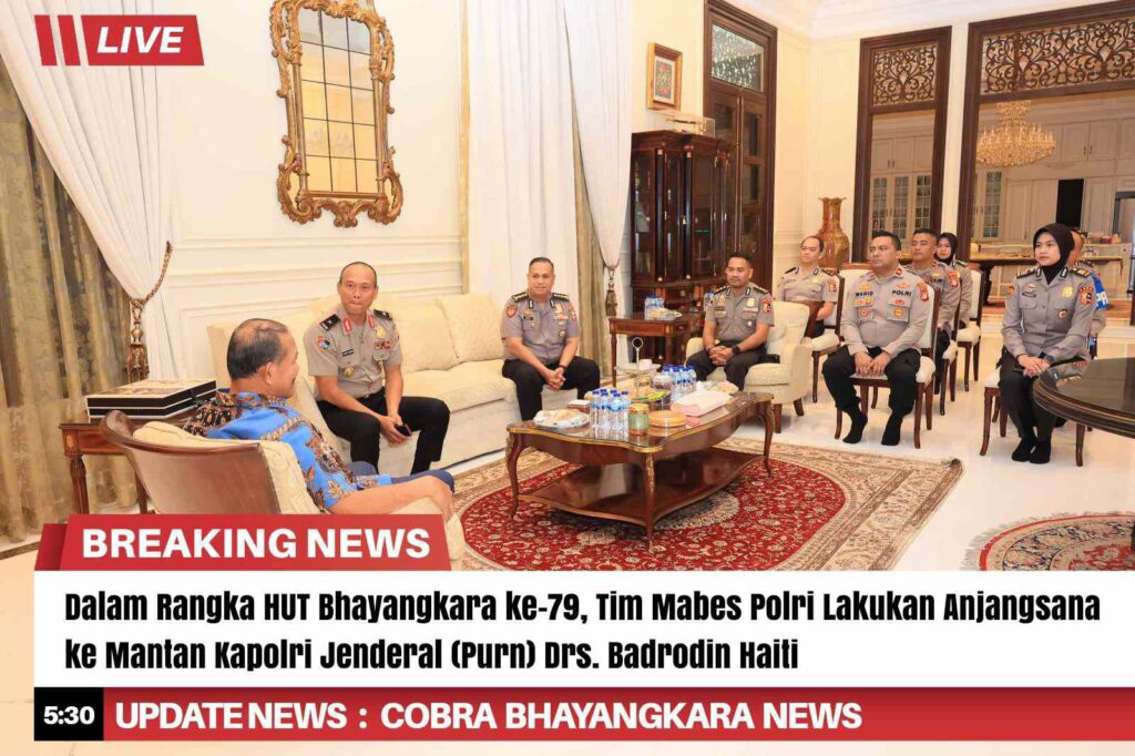 Menyambut peringatan Hari Ulang Tahun Bhayangkara ke-79, Kepolisian Negara Republik Indonesia melalui Tim dari Mabes Polri melaksanakan kegiatan anjangsana sebagai bentuk penghormatan dan silaturahmi kepada para purnawirawan Polri. Salah satu kunjungan dilakukan ke kediaman Jenderal (Purn) Drs. Badrodin Haiti, yang merupakan Mantan Kapolri ke-23.