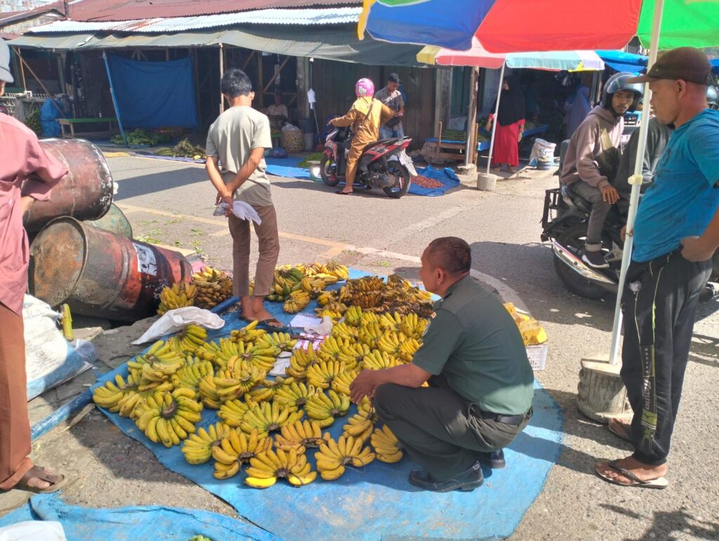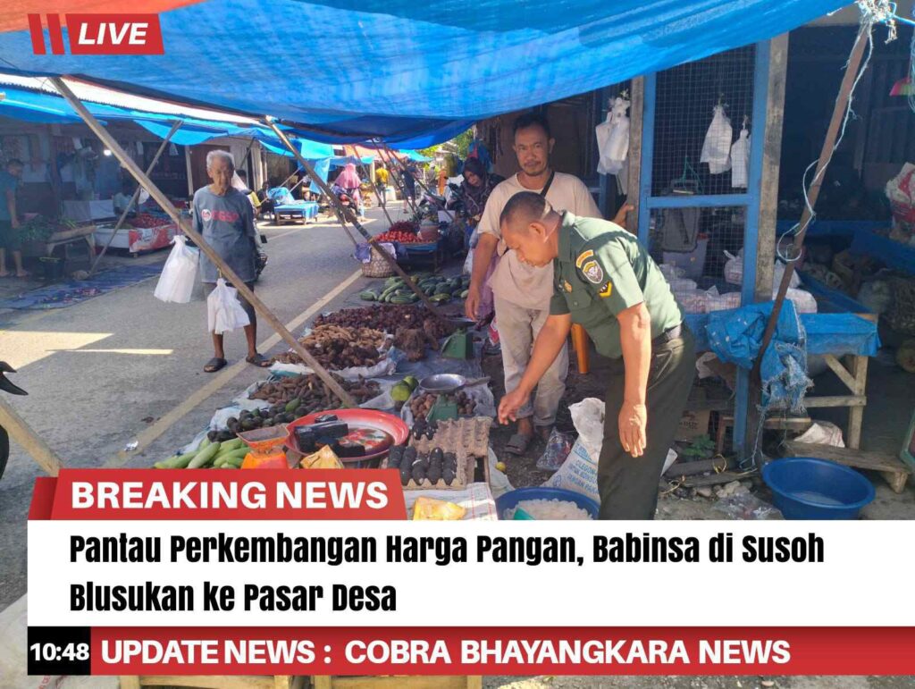 Babinsa Koramil 04/Susoh Kodim 0110/Abdya Serda Nasir mengunjungi pasar tradisional dalam wilayah binaan dalam rangka kegiatan rutin mengecek ketersediaan dan stabilitas harga bahan pokok, di Desa Gadang Kecamatan Susoh, Rabu (18/6/2025).