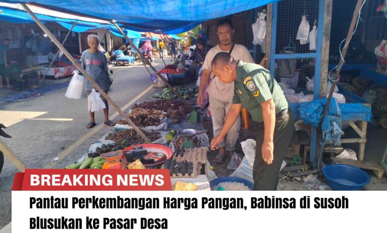 Babinsa Koramil 04/Susoh Kodim 0110/Abdya Serda Nasir mengunjungi pasar tradisional dalam wilayah binaan dalam rangka kegiatan rutin mengecek ketersediaan dan stabilitas harga bahan pokok, di Desa Gadang Kecamatan Susoh, Rabu (18/6/2025).