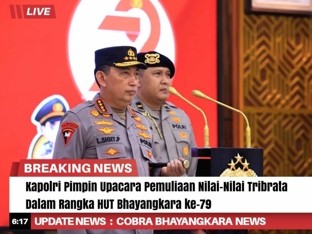 Kapolri Jenderal Polisi Drs. Listyo Sigit Prabowo memimpin Upacara Pemuliaan Nilai-Nilai Tribrata. Upacara tersebut merupakan salah satu tradisi dalam rangka memperingati Hari Bhayangkara ke-79 Tahun 2025.