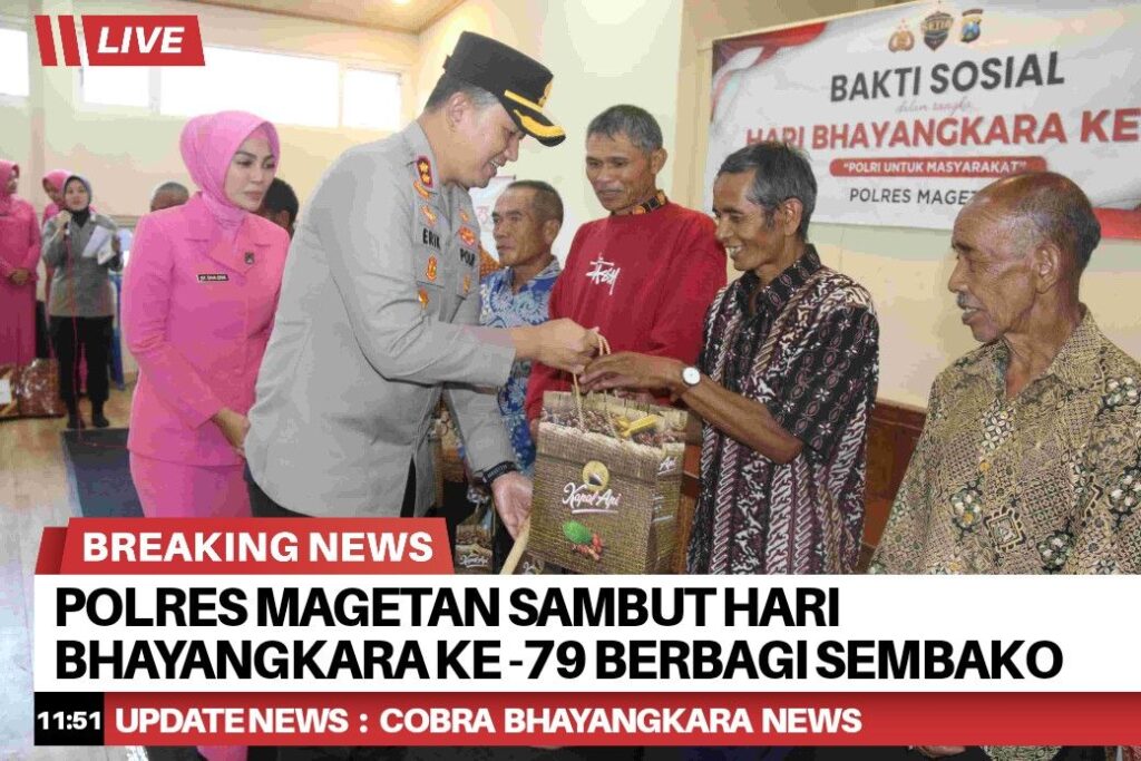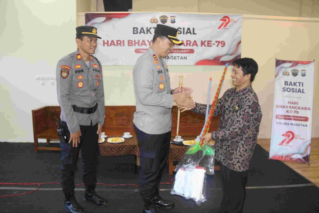 Dalam kesempatan tersebut, jajaran Polres Magetan dan Bhayangkari memberikan bantuan sosial berupa paket sembako kepada masyarakat yang membutuhkan di wilayah tersebut.