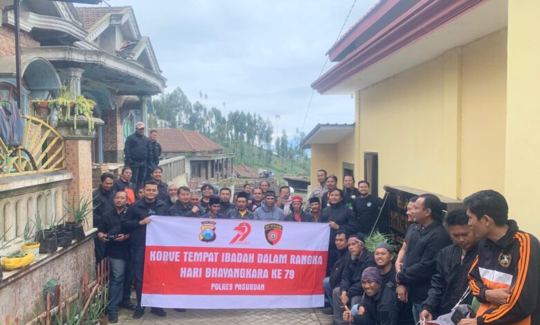 Menyambut Hari Bhayangkara ke-79, Satuan Intelkam Polres Pasuruan bersama Suporter Sakera Mania Bangil mengadakan kegiatan bakti sosial di Masjid Fatimah Baitul Azzikra, Dusun Kandangsari, Desa Mororejo, Kecamatan Tosari, Jumat (20/6/2025).