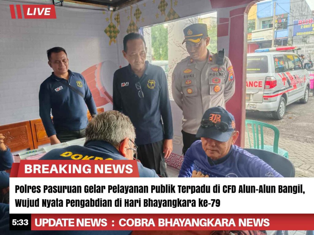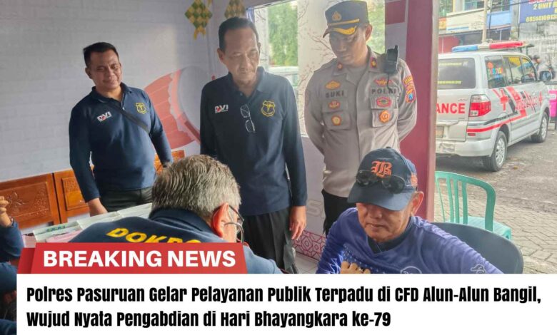 Dalam rangka memperingati Hari Bhayangkara ke-79, Polres Pasuruan menggelar kegiatan Pelayanan Publik Terpadu yang dipusatkan di area Car Free Day (CFD) Alun-Alun Bangil, pada Minggu pagi, (22/06/2025).