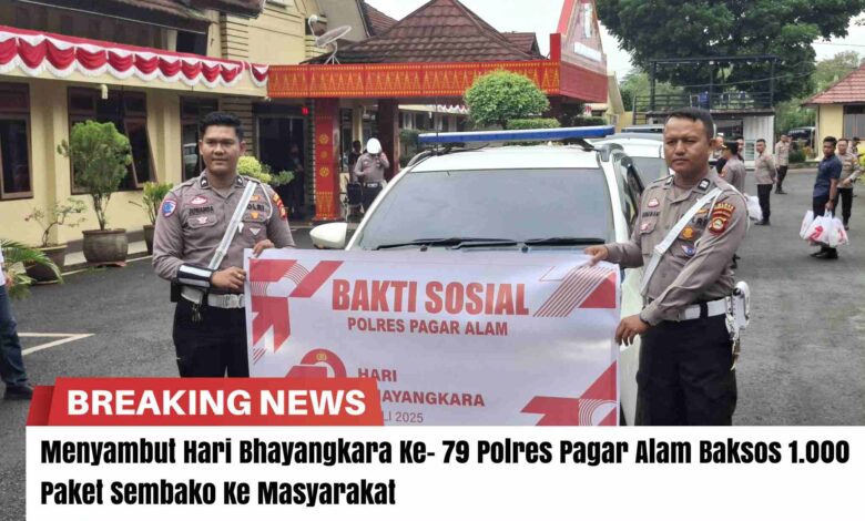 Kapolres Pagar Alam AKBP Erwin Aras Genda SH SIK MT melalui Kasi Humas Iptu Mansyur mengatakan, baksos bagi bagi paket sembako ini dalam rangka memperingati HUT Bhayangkara ke 79, gabungan satuan fungsi dan Polsek jajaran di lima kecamatan menggelar baksos serentak dengan membagikan 1.000 paket sembako,” ucap dia.