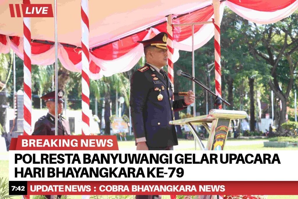 Kepolisian Resor Kota (Polresta) Banyuwangi menggelar upacara peringatan Hari Bhayangkara ke-79 dengan khidmat dan penuh semangat nasionalisme di Lapangan Taman Blambangan, Selasa (1/7/2025).