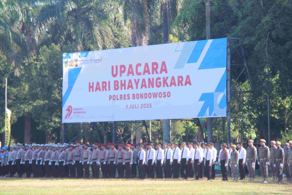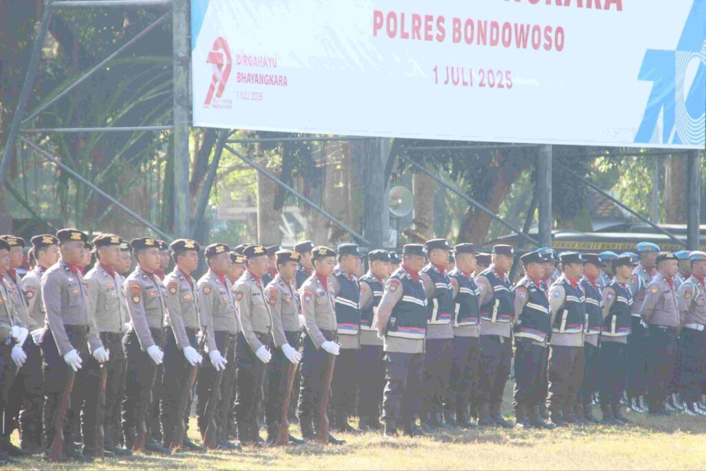 Upacara Hari Bhayangkara ke-79 Polres Bondowoso berlangsung khidmat di Alun-alun Bagus Asra Bondowoso pada Senin, 1 Juli 2025, pukul 08.00 WIB. Acara yang dipimpin langsung oleh Kapolres Bondowoso, AKBP Harto Agung Cahyono, S.H., S.I.K., M.H., sebagai Inspektur Upacara ini dihadiri oleh berbagai elemen penting masyarakat Bondowoso.
