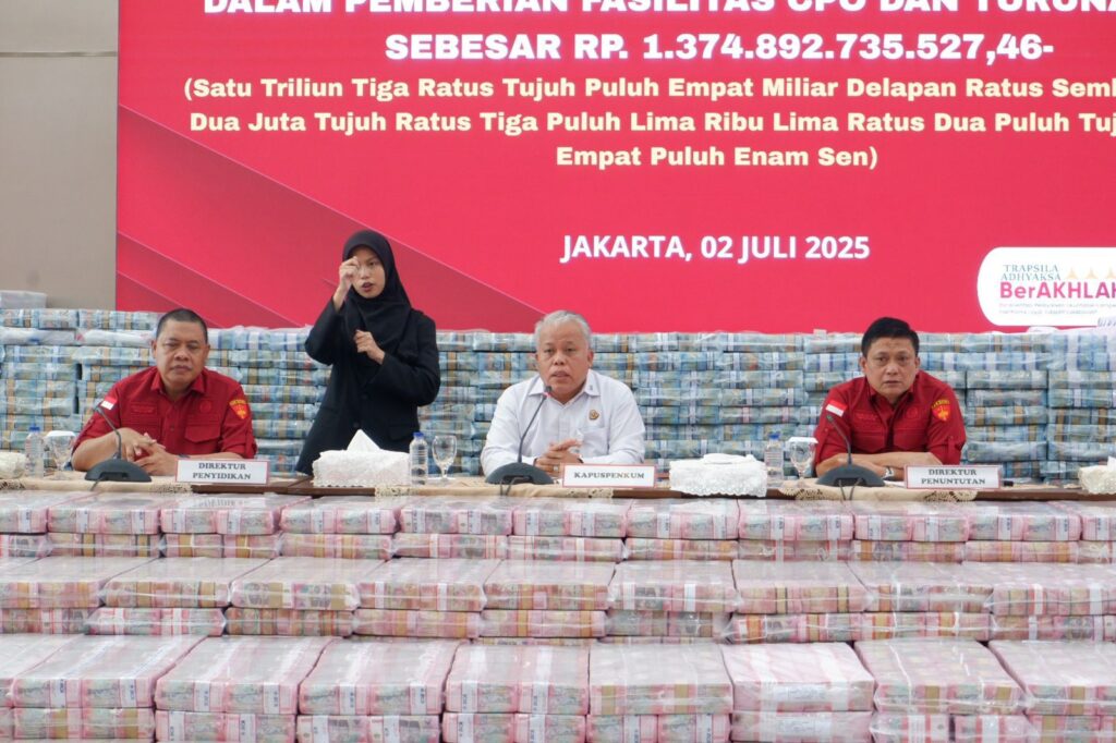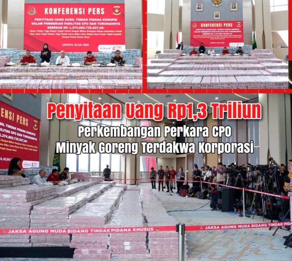 Tim Penuntut Umum dari Direktorat Penuntutan pada Jaksa Agung Muda Bidang Tindak Pidana Khusus (JAM PIDSUS) kembali melakukan penyitaan pada tingkat penuntutan terhadap uang senilai Rp1.374.892.735.527 (satu triliun tiga ratus tujuh puluh empat miliar delapan ratus sembilan puluh dua juta tujuh ratus tiga puluh lima ribu lima ratus dua puluh tujuh rupiah) terkait perkara tindak pidana korupsi fasilitas ekspor Crude Palm Oil (CPO) dan turunannya pada industri kelapa sawit tahun 2022 atas nama 12 Terdakwa Korporasi.