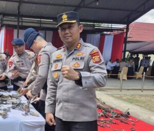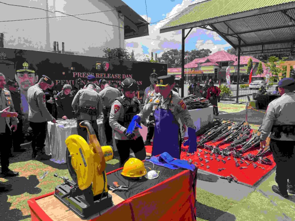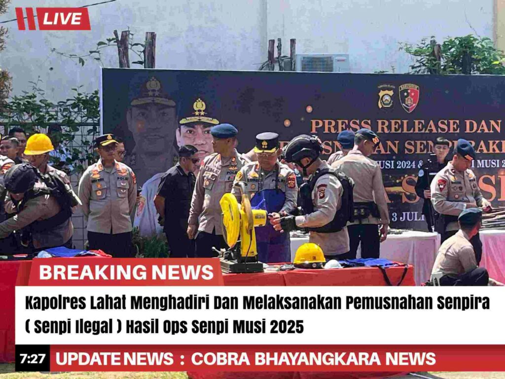 Kapolres Lahat, AKBP Novi Edyanto SIK. MIK turut hadir dan melaksanakan pemusnahan senjata api (senpira) hasil Operasi Senpi Musi 2025 di Mako Brimob Polda Sumsel. Polres Lahat dalam pelaksanaan Ops Senpi Musi 2025, berhasil mengamankan 19 (sembilan belas) Senjata Api Rakitan/ilegal baik laras panjang maupun laras pendek, yang mana 1(satu) pucuk Senpira laras panjang adalah hasil tangkapan Satgas Gakkum Ops Senpi Musi 2025 Polres Lahat, dengan mengamankan 1 (satu) tersangka, sedangkan 18 Senpira baik laras panjang dan pendek hasil serahan dari masyarakat.
