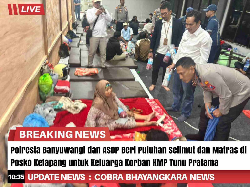 Kapolresta Banyuwangi, Kombes Pol. Rama Samtama Putra bersama General Manager (GM) ASDP Ketapang, Yannes Kurniawan , turun langsung membagikan bantuan logistik berupa ratusan selimut dan matras tidur kepada keluarga korban yang masih menunggu di area Pelabuhan ASDP Ketapang, Jumat malam (4/7).