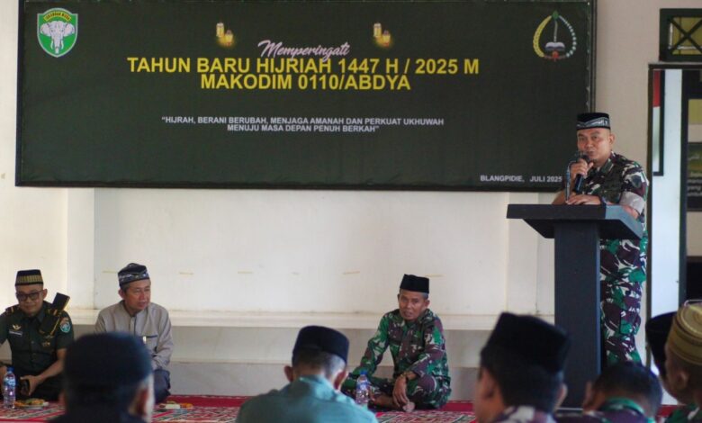 Komandan Kodim 0110/Abdya Letkol Inf Beni Maradona, S.Sos mengajak prajurit dan Persit di jajarannya terus memperbaiki jati diri dengan cara meningkatkan kebaikan dalam kehidupan. Ajakan itu disampaikannya saat membuka acara peringatan Tahun Baru Islam 1 Muharram 1447 H di aula Makodim setempat, Desa Keude Paya Kecamatan Blangpidie, Senin (7//7/2025) sore.