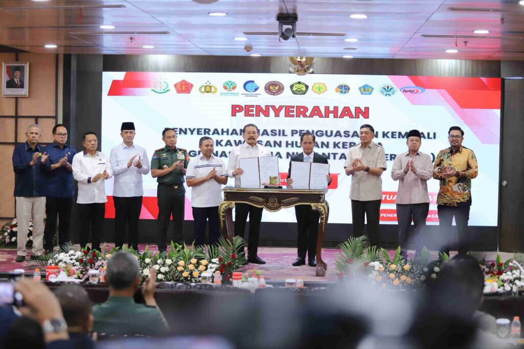 Satuan Tugas Penertiban Kawasan Hutan (Satgas PKH) melaksanakan Penyerahan Penguasaan Kembali Kawasan Hutan Tahap II seluas 1 Juta hektare kepada PT Agrinas Palma Nusantara dan Penguasaan Taman Nasional Tesso Nilo serta Kebun Kelapa Sawit Hasil Penguasaan Satgas PKH.