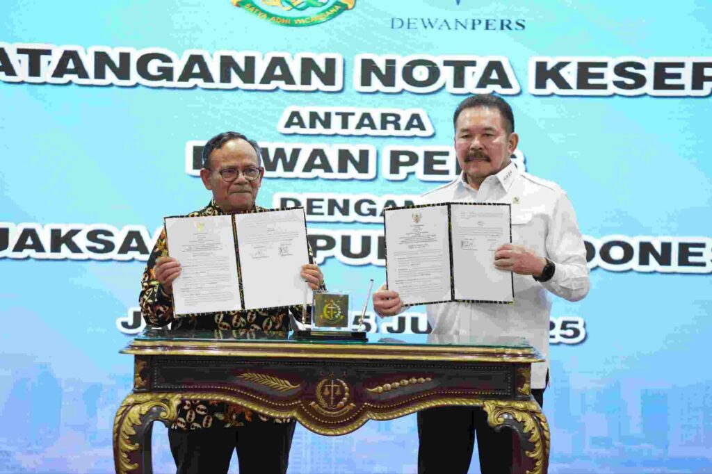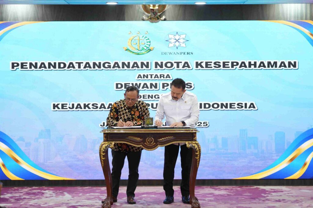 Kejaksaan Republik Indonesia dan Dewan Pers melaksanakan menandatangani Nota Kesepahaman (MoU) pada Selasa 15 Juli 2025, tentang “Koordinasi Dalam Mendukung Penegakan Hukum, Perlindungan Kemerdekaan Pers, Peningkatan Kesadaran Hukum Masyarakat, serta Peningkatan Kapasitas Sumber Daya Manusia”.