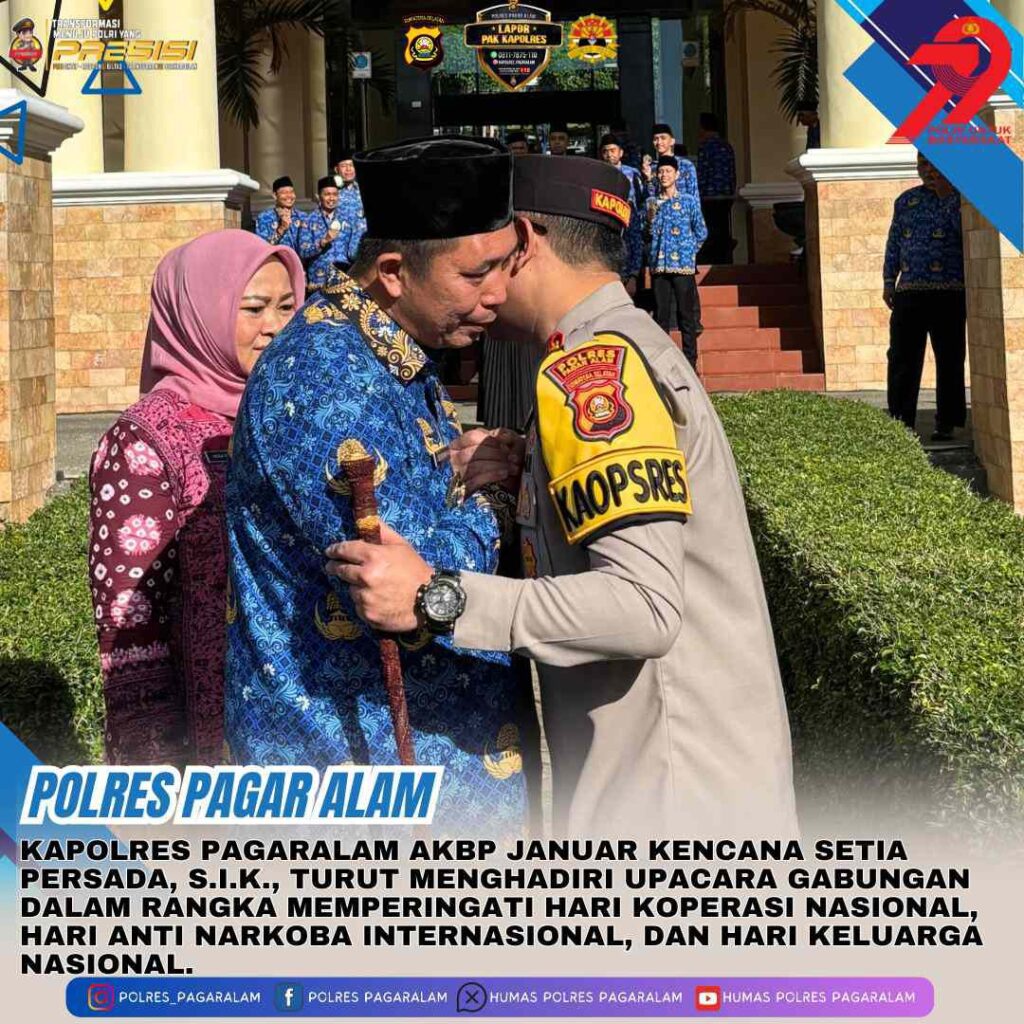 Kapolres Pagar Alam AKBP Januar Kencana Setia Persada, S.I.K., turut menghadiri upacara gabungan dalam rangka memperingati Hari Koperasi Nasional, Hari Anti Narkoba Internasional, dan Hari Keluarga Nasional. Kegiatan ini dilaksanakan dengan khidmat dan dipimpin langsung oleh Walikota Pagar Alam, Ludi Olyansyah,