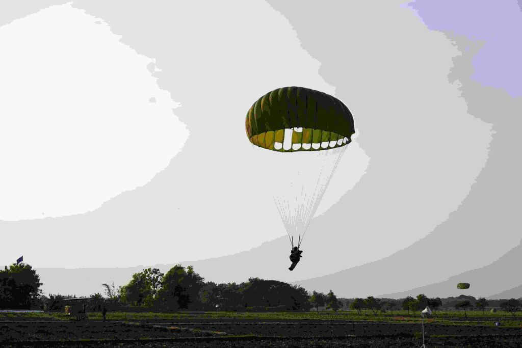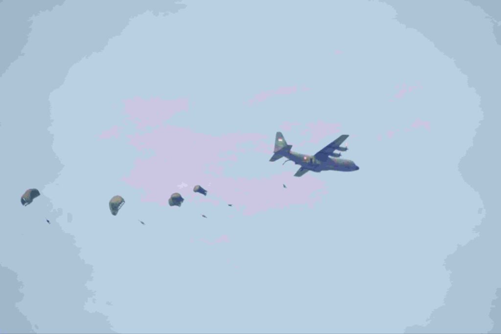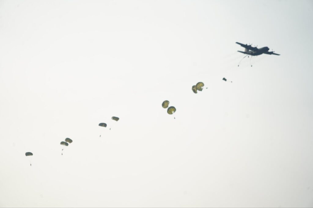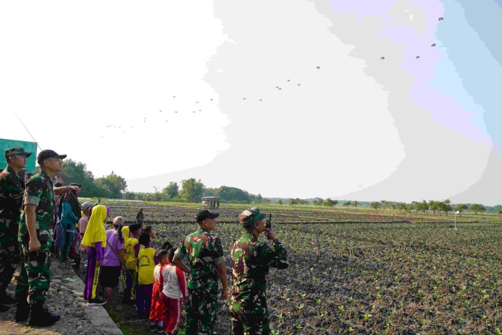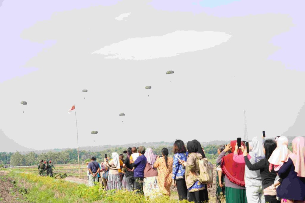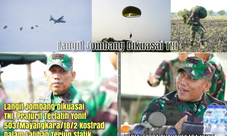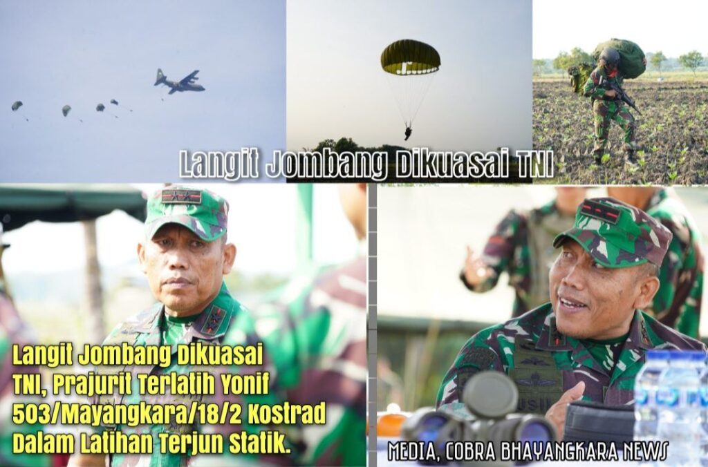 Kilauan parasut mengembang di angkasa Jombang, menyuarakan semangat prajurit terlatih Yonif 503/Mayangkara/18/2 Kostrad dalam Latihan Terjun Statik penyegaran (Jungar). Ratusan prajurit berkualifikasi Para membuktikan kapabilitasnya dalam tiga gelombang penerjunan menggunakan pesawat C-130/Hercules milik TNI AU. Jombang (17/7/2025).