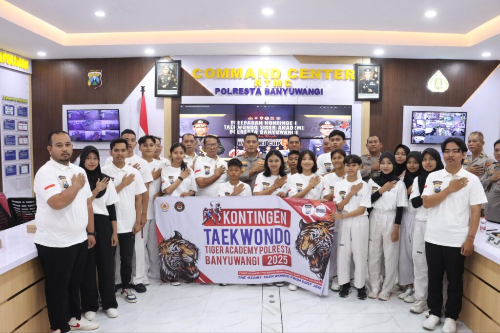 Kapolresta Banyuwangi, Kombes Pol Rama Samtama Putra, S.I.K., M.Si., M.H., melepas keberangkatan kontingen Taekwondo Tiger Akademi Polresta Banyuwangi yang akan mengikuti ajang Kejuaraan Nasional Kapolri Cup 6, Kamis (24/7/2025).