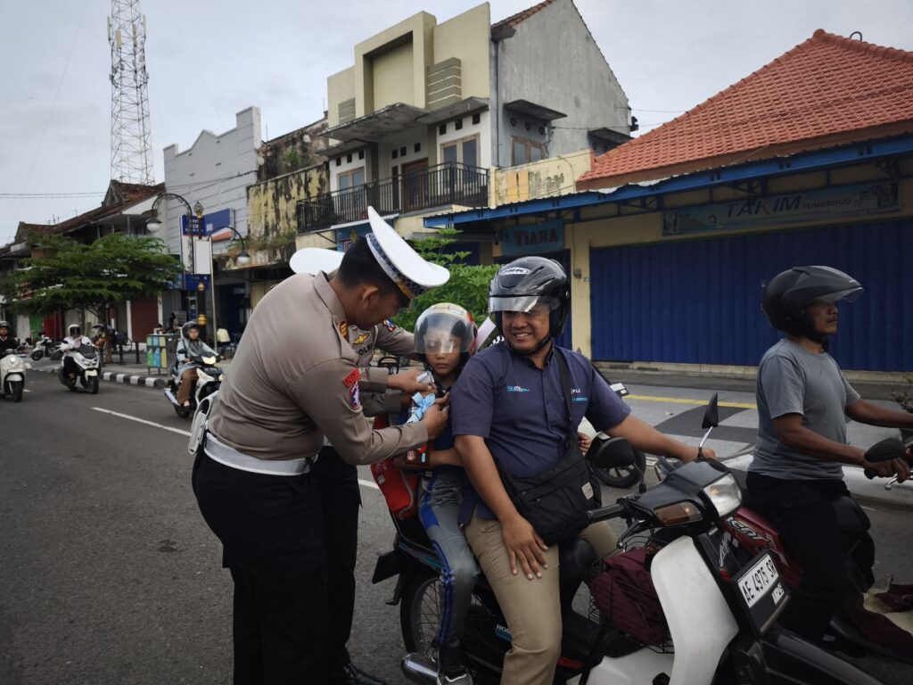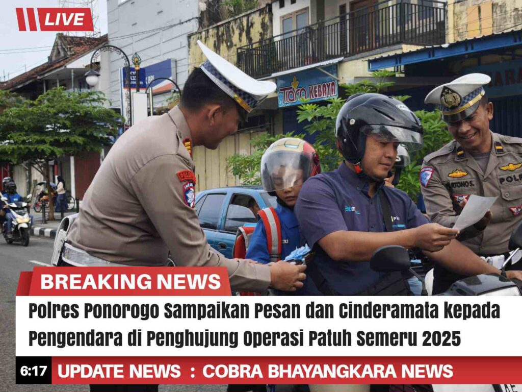 Dalam rangka pelaksanaan Operasi Patuh Semeru 2025, Satuan Lalu Lintas Polres Ponorogo menggelar kegiatan simpatik dengan memberikan cinderamata kepada para pengendara yang dinilai tertib dalam berlalu lintas.