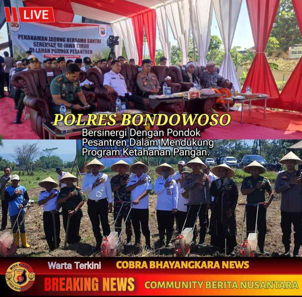 Dalam rangka mendukung program Presiden RI Prabowo Subianto dalam ketahanan pangan untuk warga,Polres Bondowoso melaksanakan penanaman jagung di Desa Kerang Sukosari,tepatnya di Persawahan Ponpes Mambaul ulum yang diasuh oleh Lora Nurul Jamal Habaib,SH Rabu,06/08/2025.