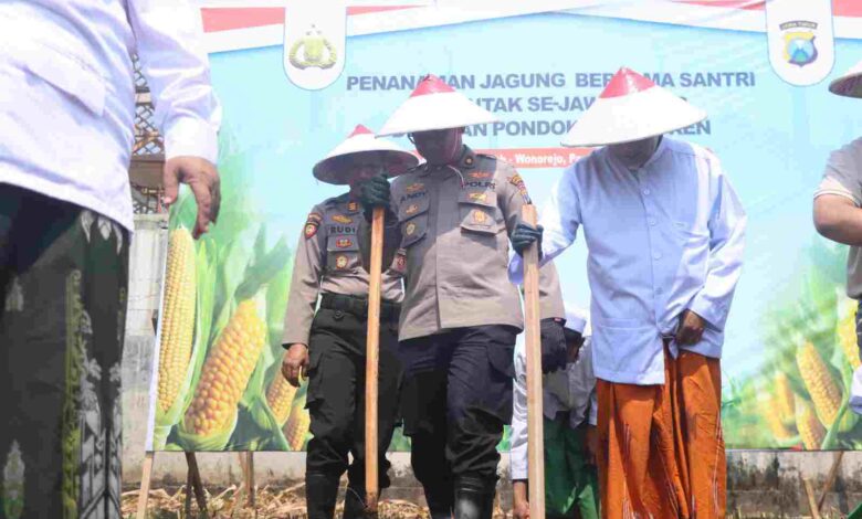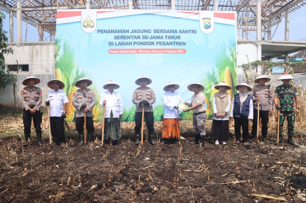 Dalam rangka mendukung program swasembada pangan nasional, Polres Pasuruan menggelar kegiatan penanaman jagung serentak bersama para santri di lahan Pondok Pesantren Sabilunnajah, Desa Lebaksari, Kecamatan Wonorejo, Rabu (6/8/2025).