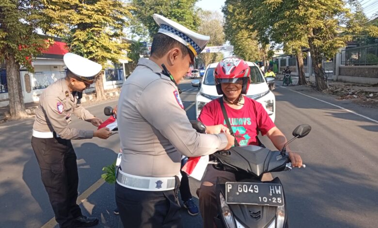 Nggak cuma menjaga ketertiban lalu lintas, kali ini mereka membagikan dan memasangkan bendera Merah Putih ke pengendara yang melintas di jalan Letjen. Panjaitan depan kantor Sat Lantas Jember.