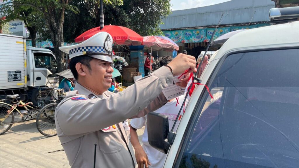 Selain membagikan bendera, petugas juga menyampaikan imbauan tertib lalu lintas serta ajakan untuk ikut merayakan kemerdekaan secara damai dan penuh makna.