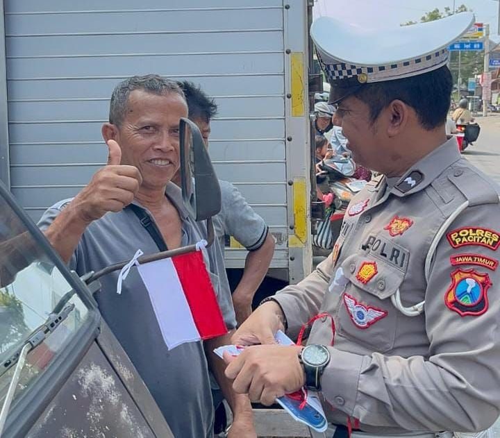 Dengan turun langsung ke jalan, personel Unit Turjagwali Satlantas Polres Pacitan Polda Jatim membagikan bendera Merah Putih kepada para pengendara yang melintas di perempatan lampu merah Penceng, Selasa (5/8/2025).