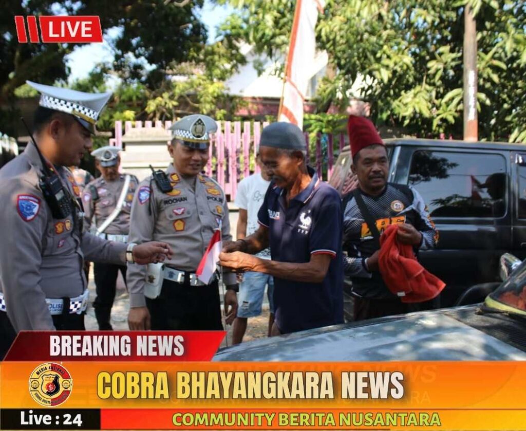 Gugah semangat nasionalisme, Satuan Lalu Lintas Polres Bondowoso membagikan bendera Merah Putih kepada pengemudi angkutan hewan dijalan Pasar Hewan Kademangan Bondowoso.