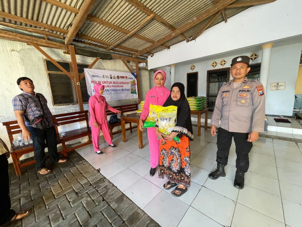 Polsek Winongan menyalurkan 1 ton beras dalam program Gerakan Pangan Murah yang digelar di halaman Mapolsek Winongan, pada Senin (11/8/2025).