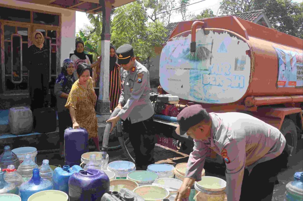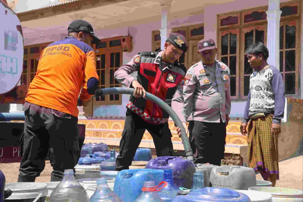Sebagai bentuk kepedulian terhadap masyarakat yang terdampak kekeringan, Polres Probolinggo Polda Jatim bersama BPBD menggelar bakti sosial (baksos) pendistribusian air bersih, di Desa Tulupari dan Desa Rejing, Kecamatan Tiris, Senin (11/8/2025).