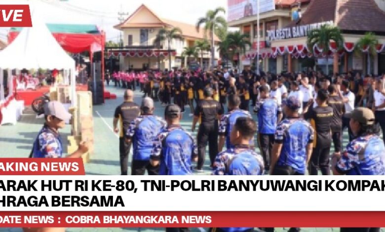 TNI-Polri Kompak Olahraga Bersama Sambut HUT Kemerdekaan RI Ke-80 di Mapolresta Setempat. Suasana ceria memenuhi halaman Mapolresta Banyuwangi. Ratusan personel TNI, Polri, Lanal, dan Bhayangkari berkumpul memperingati HUT Kemerdekaan RI ke-80. Jumat, 15 Agustus 2025.
