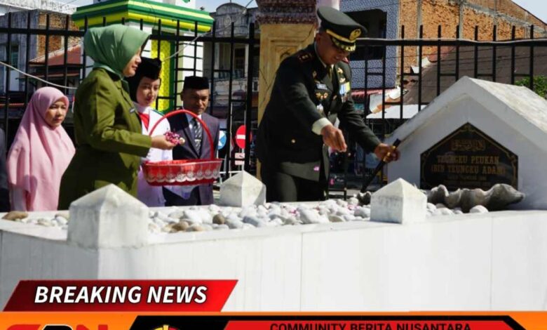 Komandan Kodim (Dandim) 0110/Abdya Letkol Inf Beni Maradona, S.Sos bersama jajaran Forum Koordinasi Pimpinan Daerah (Forkopimda) mengikuti upacara ziarah ke makam pahlawan Tengku Peukan di Kompleks Masjid Jamik Baitul Adhim, Desa Pasar, Kecamatan Blangpidie, Sabtu (16/8/2025) pagi.