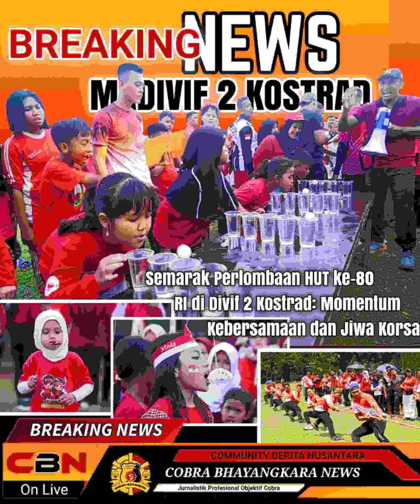 Dalam rangka memperingati Hari Ulang Tahun ke-80 Kemerdekaan Republik Indonesia, Divisi Infanteri 2 Kostrad menggelar serangkaian perlombaan meriah yang melibatkan seluruh keluarga besar satuan. Bertempat di Lapangan Penegak Sapta Marga, Madivif 2 Kostrad, kegiatan ini menjadi ajang silaturahmi dan pemupuk semangat kebersamaan antar prajurit, Persit, dan anak-anak. (Singosari, 16 Agustus 2025).