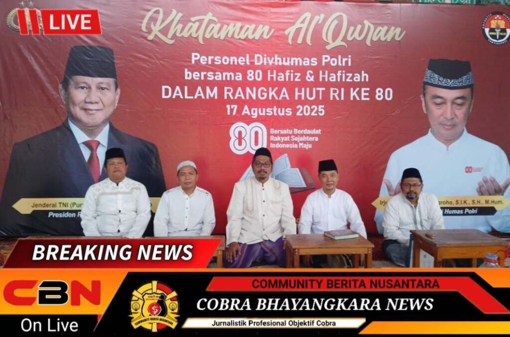 Polri melalui Divisi Humas melaksanakan khataman Al-Qur’an bersama 80 Hafiz dan Hafizah di Yayasan Daarul Quran Indonesia, Kota Tangerang. Kegiatan ini menjadi salah satu wujud syukur atas nikmat kemerdekaan yang sudah dirasakan selama 80 tahun dan mendoakan keselamatan bangsa Indonesia ke depannya.