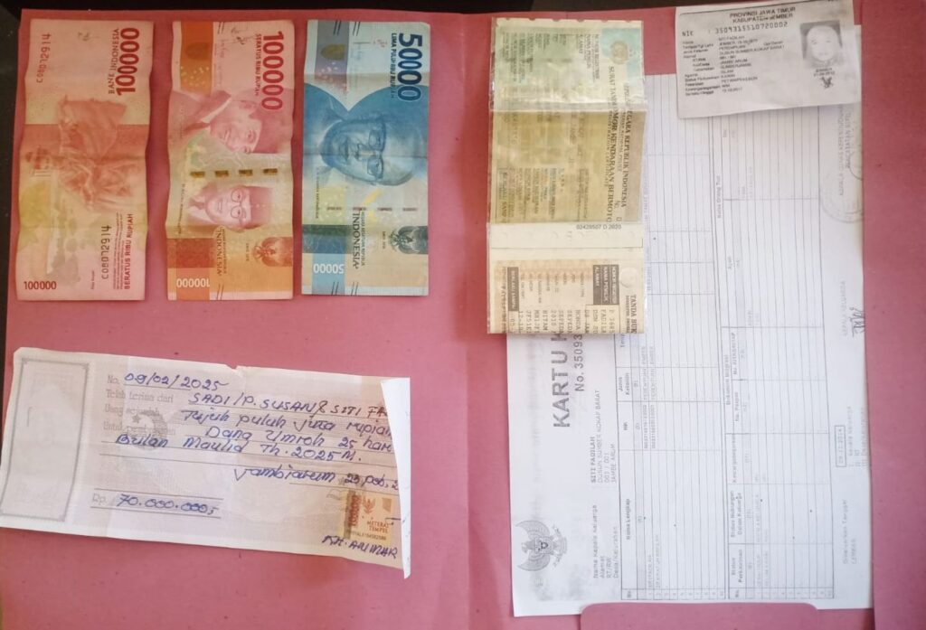 Pelaku diketahui bernama Hasan (50), warga Desa Banyuwangi, Kecamatan Wringin, Bondowoso. Dari tangan pelaku, polisi menyita barang bukti berupa satu buah tas warna merah hati yang berisi uang tunai Rp250 ribu, sebuah STNK Honda Beat, kwitansi umroh, serta satu unit sepeda motor Honda Beat warna merah yang digunakan pelaku.