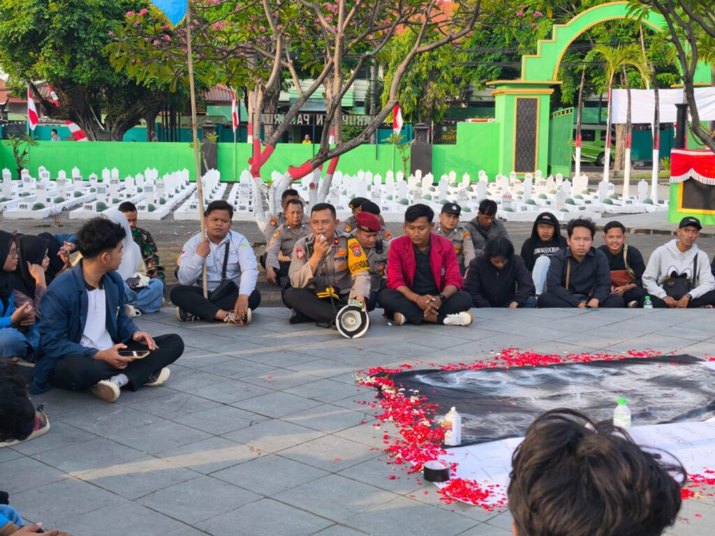 Polres Pasuruan hadir membersamai aksi damai yang digelar Badan Eksekutif Mahasiswa (BEM) Pasuruan Raya di Taman Makam Pahlawan (TMP) Bangil, Minggu (31/8/2025).